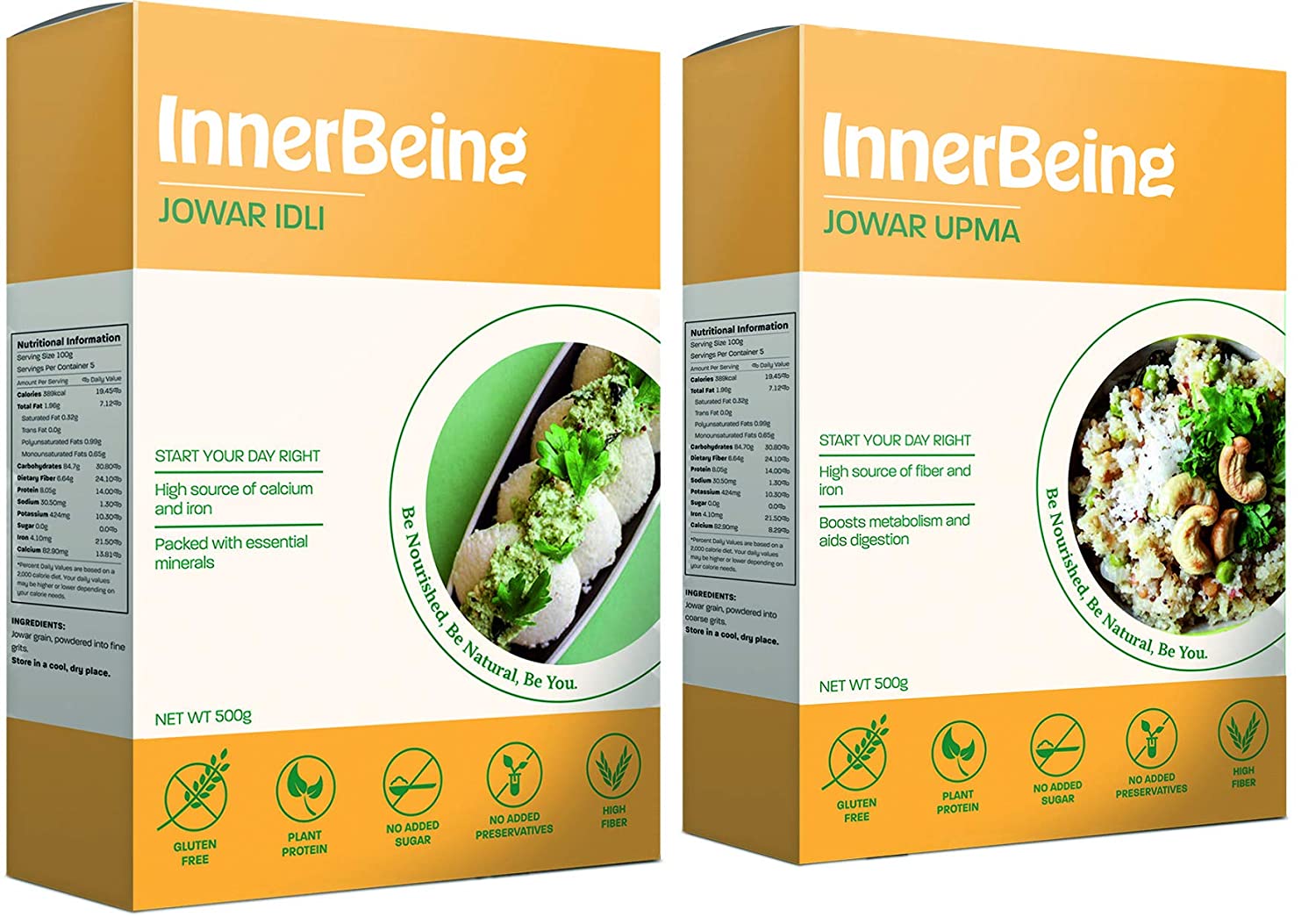 - InnerBeing's vegetarian and gluten-free Jowar Idli + Jowar Upma rava is packed with protein & fiber to boost your digestive health. Start your day healthy with low GI Idli & Upma